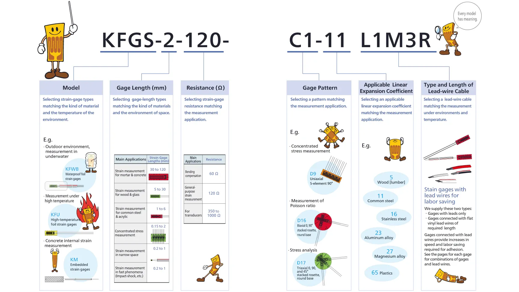 모델명 - 게이지길이(mm) - 저항 - 게이지패턴 - 선팽창계수 - 리드선 타입/길이